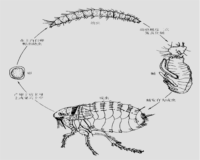 (1)跳蚤的生活習性 1)跳蚤生活史。跳蚤屬于完全變態(tài)昆蟲,生活史有卵、幼蟲、蛹、成蟲4個時期(見圖6—5)。雌蚤交配后產(chǎn)卵,大多產(chǎn)于宿主毛內(nèi)或巢穴的塵土中。溫、濕度適宜時約5天可孵化出幼蟲,幼蟲蛆形,乳白色,無眼無足,多在陰暗地面、縫隙中及鼠洞、犬貓窩等處活動。幼蟲經(jīng)3個齡期,適宜條件下2~3周蛻皮兩次發(fā)育為成熟幼蟲,其自行吐絲做繭,在繭內(nèi)化蛹。蛹期通常1~2周,有的長達1年或更長。成蟲羽化出繭需要刺激,如動物來臨所帶來的空氣振動,接觸壓力,或溫度升高,均可誘導成蟲破繭而出,否則可靜伏于繭內(nèi)。通常由卵發(fā)育為成蟲約需1 個月。雌蚤一生可產(chǎn)卵數(shù)百至上千個,壽命為l~2年。 2)棲息習性 ①宿主選擇性跳蚤寄生于恒溫動物體上,絕大多數(shù)是體外寄生蟲,通常寄生在嚙齒動物鼠類體上。因蚤種繁多,對宿主的選擇性因種而異,大致可分為3種類型。
